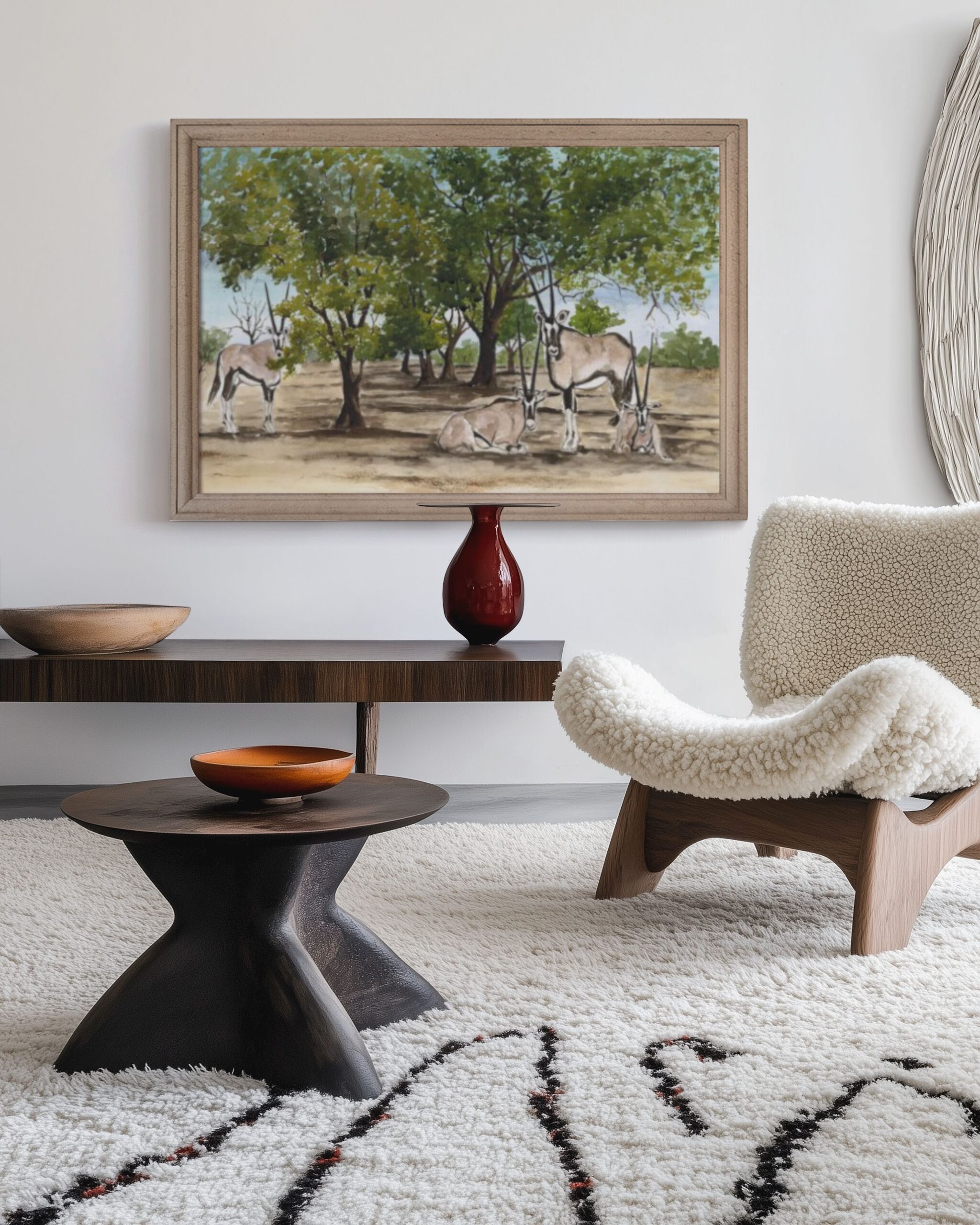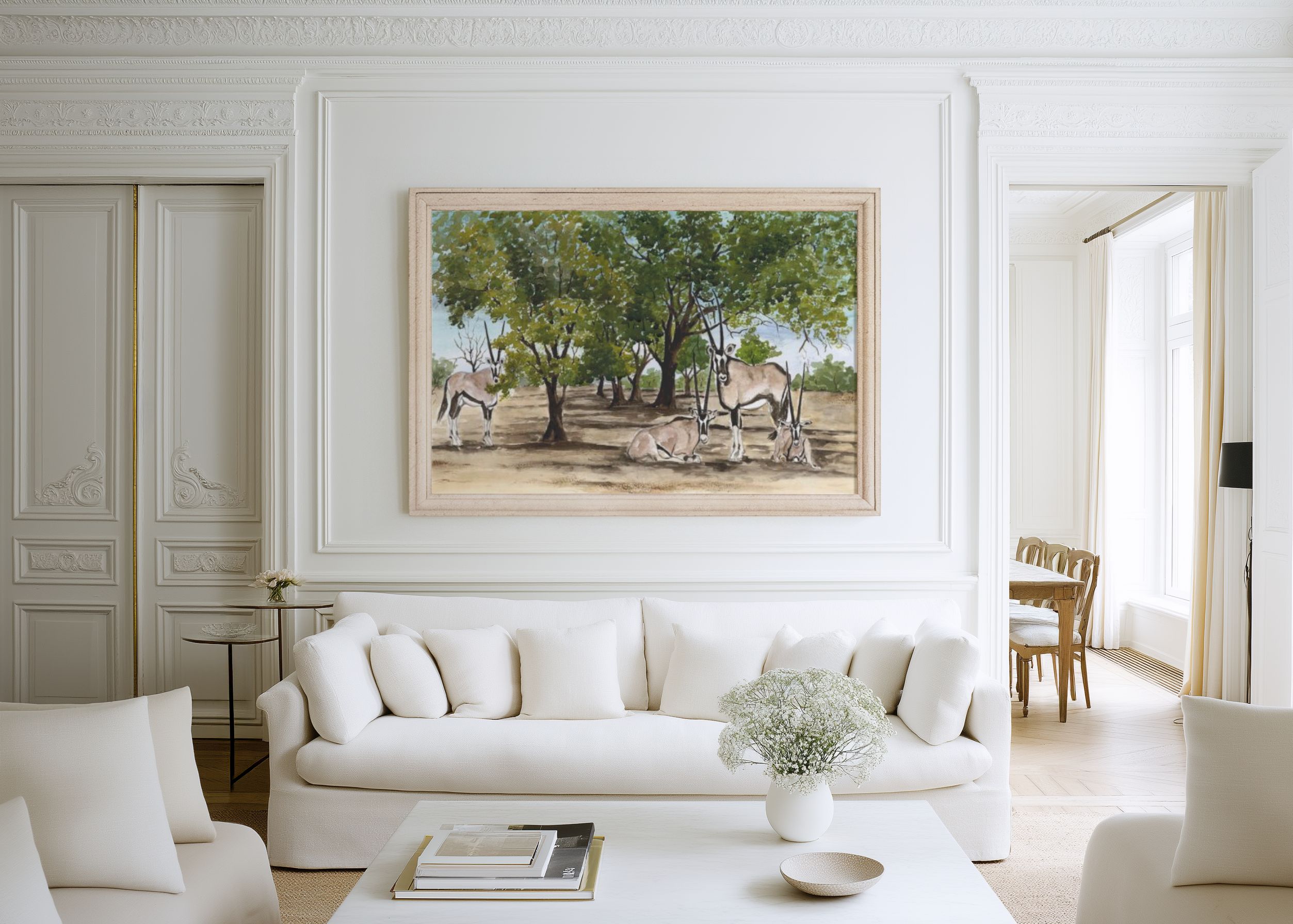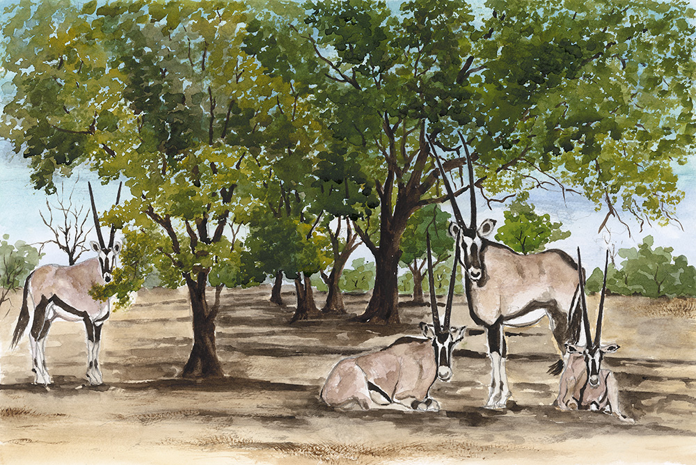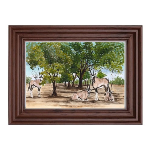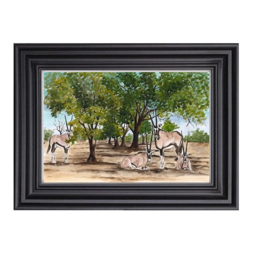 Limited Edition of One of Fanele’s amazing watercolour art works show casing the mighty Gemsboks resting in the shade of trees. These magnificent antelopes are found in Matabeleland North in Zimbabwe and they spread west wards into Botstwana, Namibia and South Africa. They are very highly adaptable antelopes that survive even in the harsh Kalahari Sands of Namibia where possibly their highest population is found.