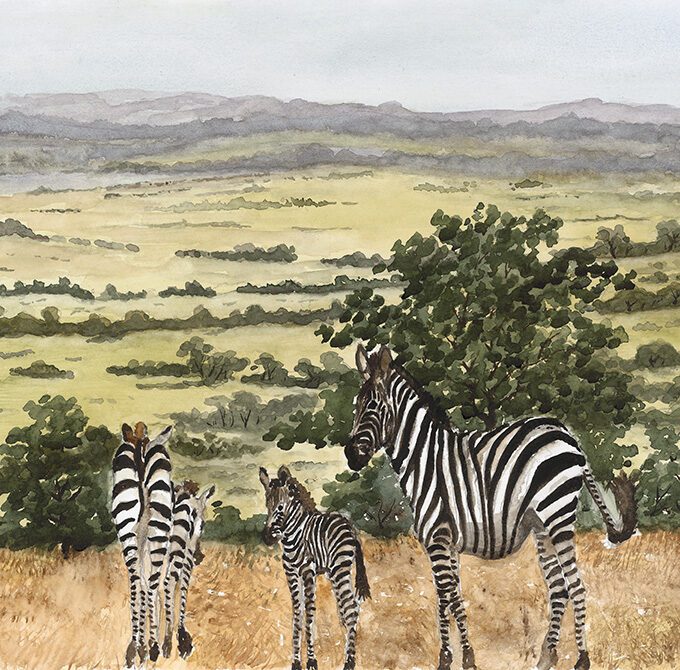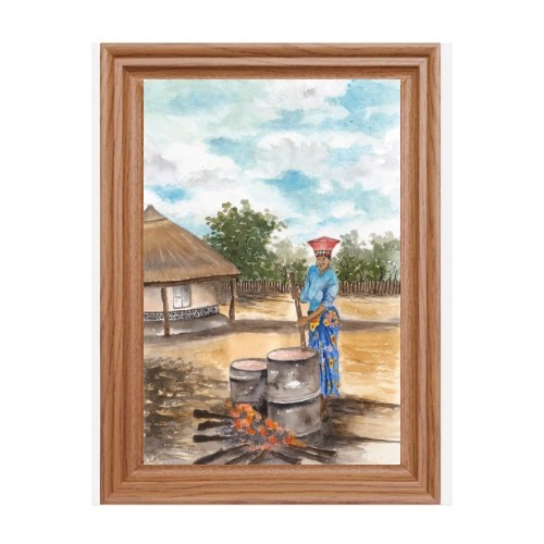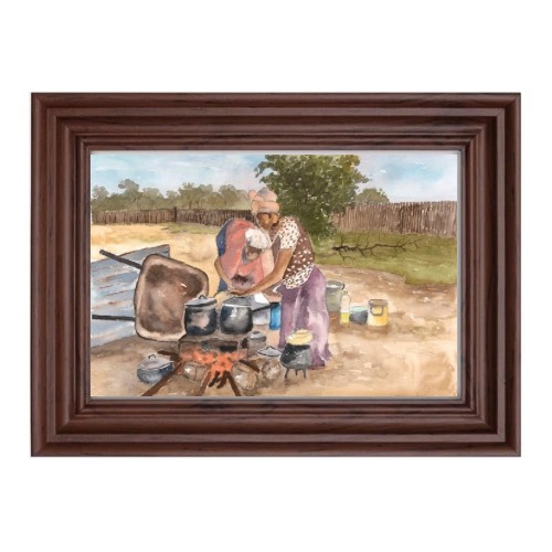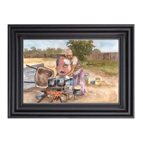 Limited Edition of One of Fanele’s amazing watercolour art works showcasing Nguni women cooking food for the family under the African skies. The meal produced usually has a delicate aroma of the type of wood that was used to make the fire. Women also have to control the heat by removing some of the burning logs.