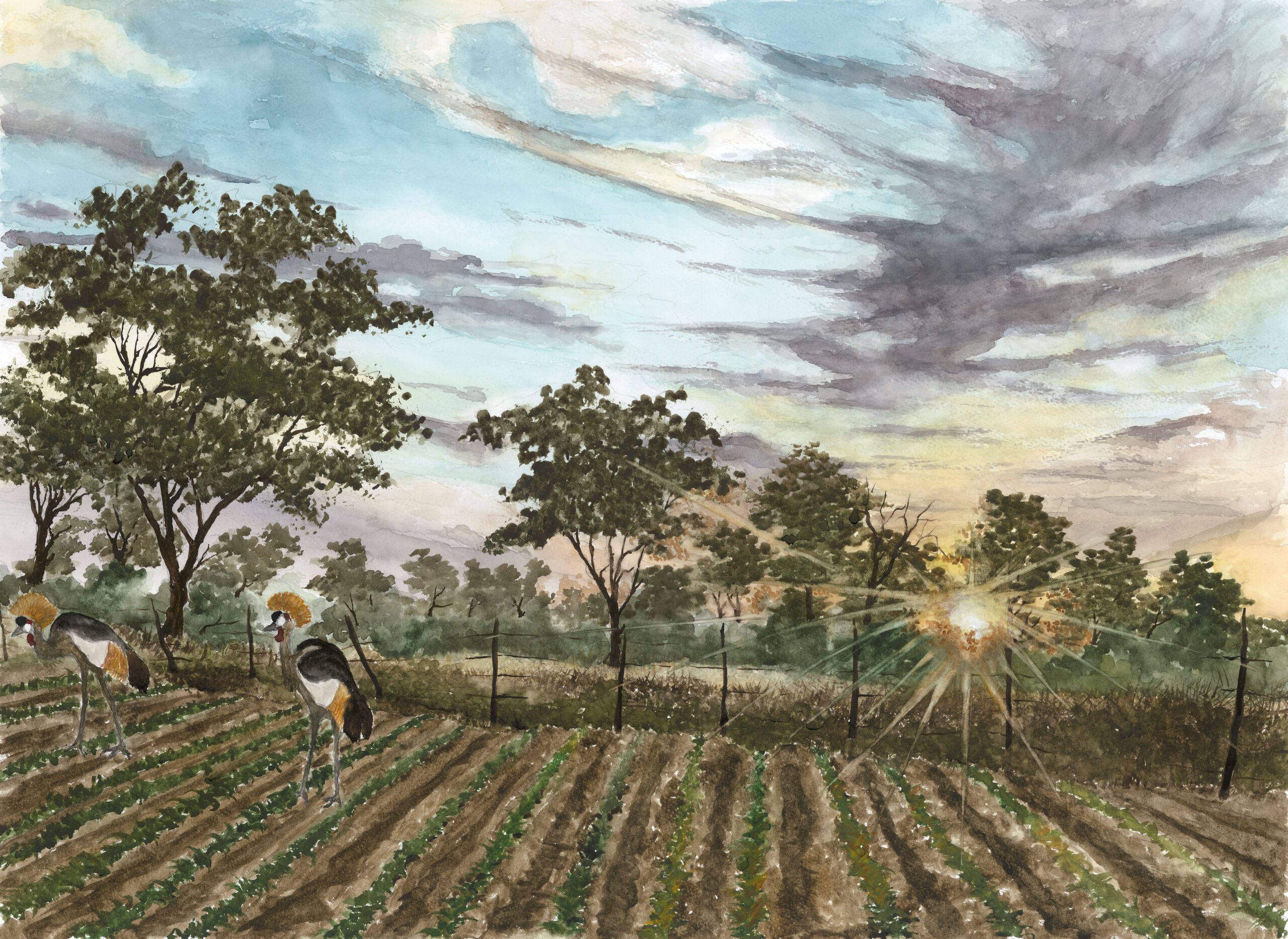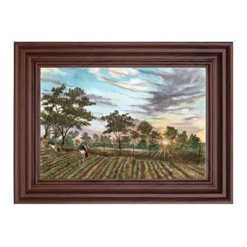 Limited Edition of One of Fanele’s amazing watercolour art works showcasing the amazing crowned cranes. The crowned cranes are listed as endangered on the IUCN Red List and protected by law in South Africa, Zimbabwe, Uganda and Kenyas, but the most fascinating law of protecting these magnificent birds was the story told by villagers, that the crowned cranes were sacred birds that should not be touched or harmed in any shape or form. It was told that if you accidentally or intentionally shot one with a sling shot and it died the other bird(they are always in pairs) would mourn for the other bird loudly until the person who shot it loses a relative as a result the artist grew up scared of coming near them.